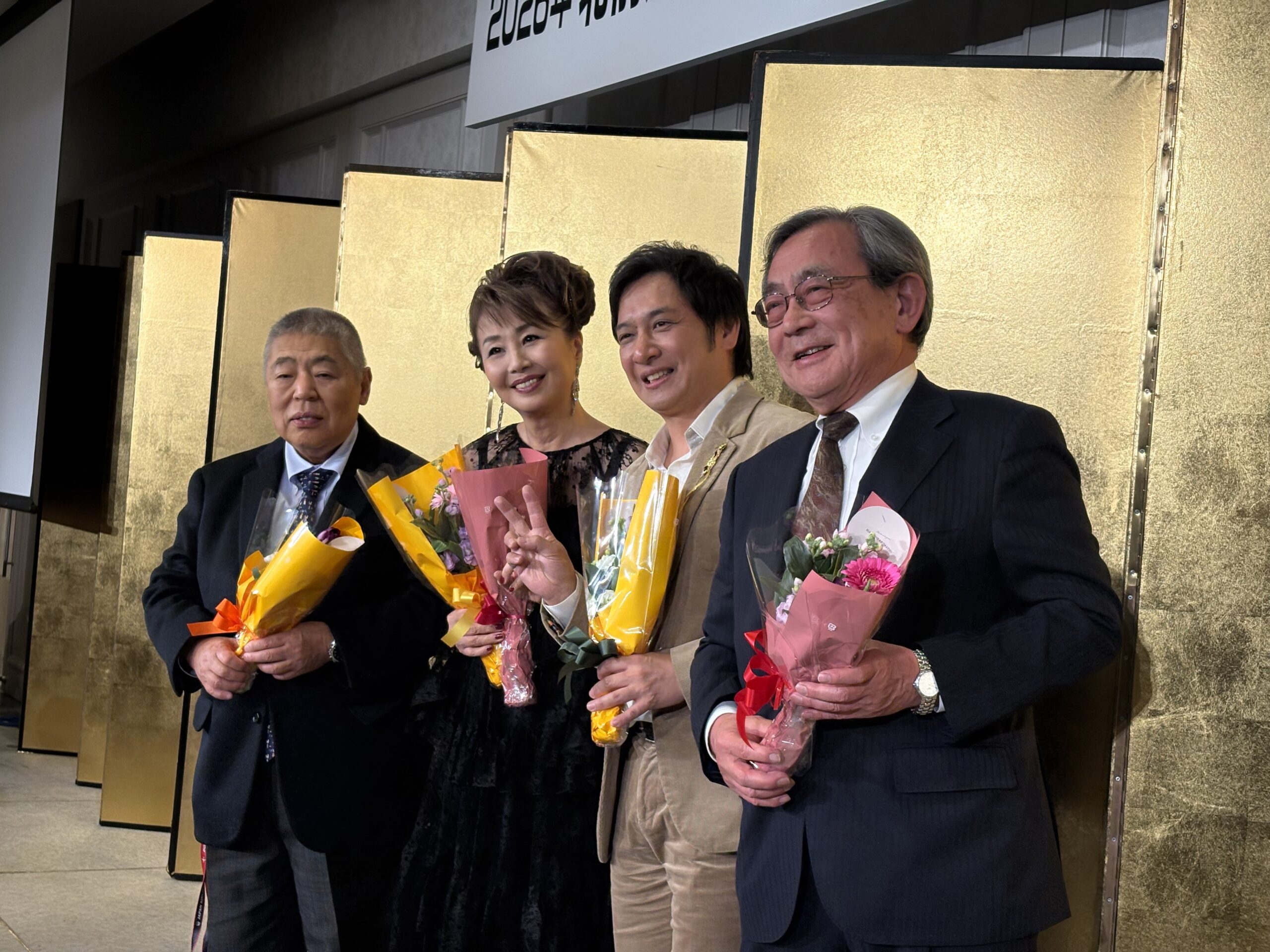 続いて、歌や演奏で会を彩った出演者らへの花束贈呈が行われ、松原健之氏、柳澤純子氏、池田敏博氏、観光庁元長官の久保茂人氏が登壇。プレゼンターから花束が手渡され、会場からは温かな拍手が送られた。久保氏の誕生日が紹介される場面もあり、祝福ムードの中で交流はさらに深まり、新年会は終始和やかな空気のまま進行した。